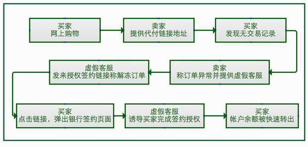 还有值得注意的一点是,在陈女士的案例中,陈女士遭遇的实际上是连环欺诈:骗子首先通过发送商品的代付链接,完成了第一次欺诈;之后又利用代付交易不会在淘宝账户上生成交易记录的特点,以卡单、系统出现异常等借口将陈女士诱骗到虚假客服,最终通过虚假客服完成了授权支付的欺诈。下图是整个欺诈过程的示意图: