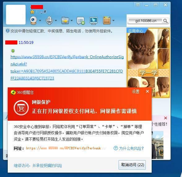 不过,由于近期与授权支付相关的欺诈案件连续发生,而且涉案金额巨大,受害者大多损失惨重,因此,360互联网安全中心特别调整了防护策略,针对来自即时通信工具中的授权支付链接进行风险提示,如下图: